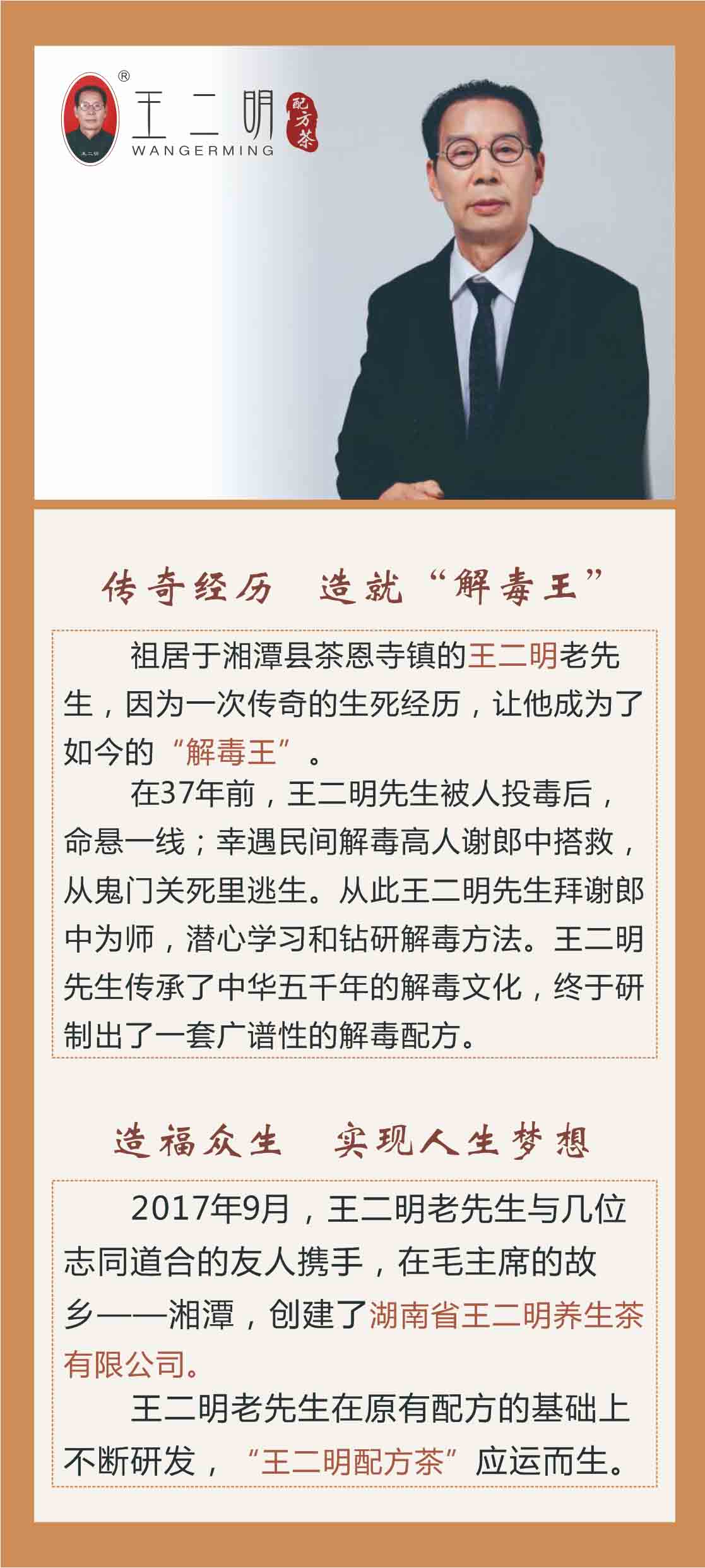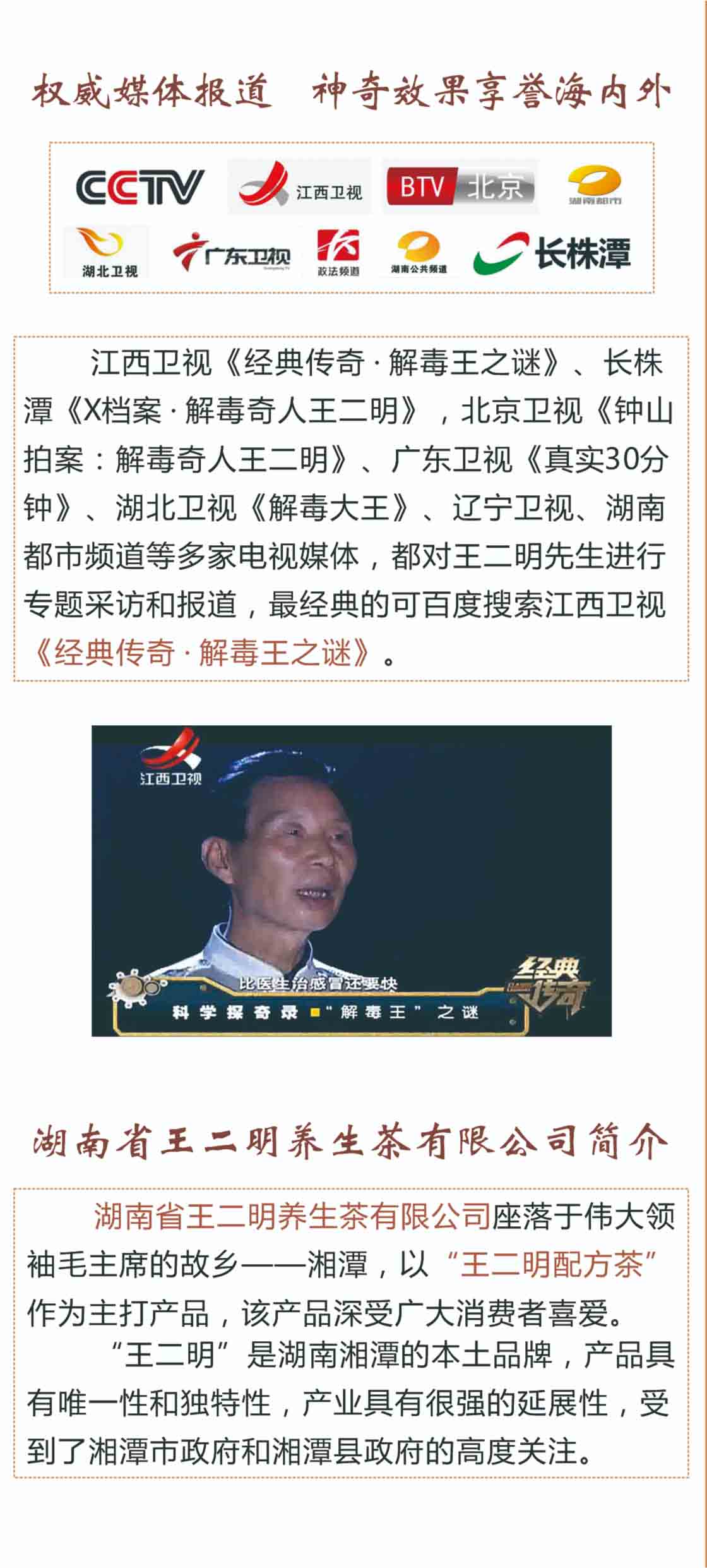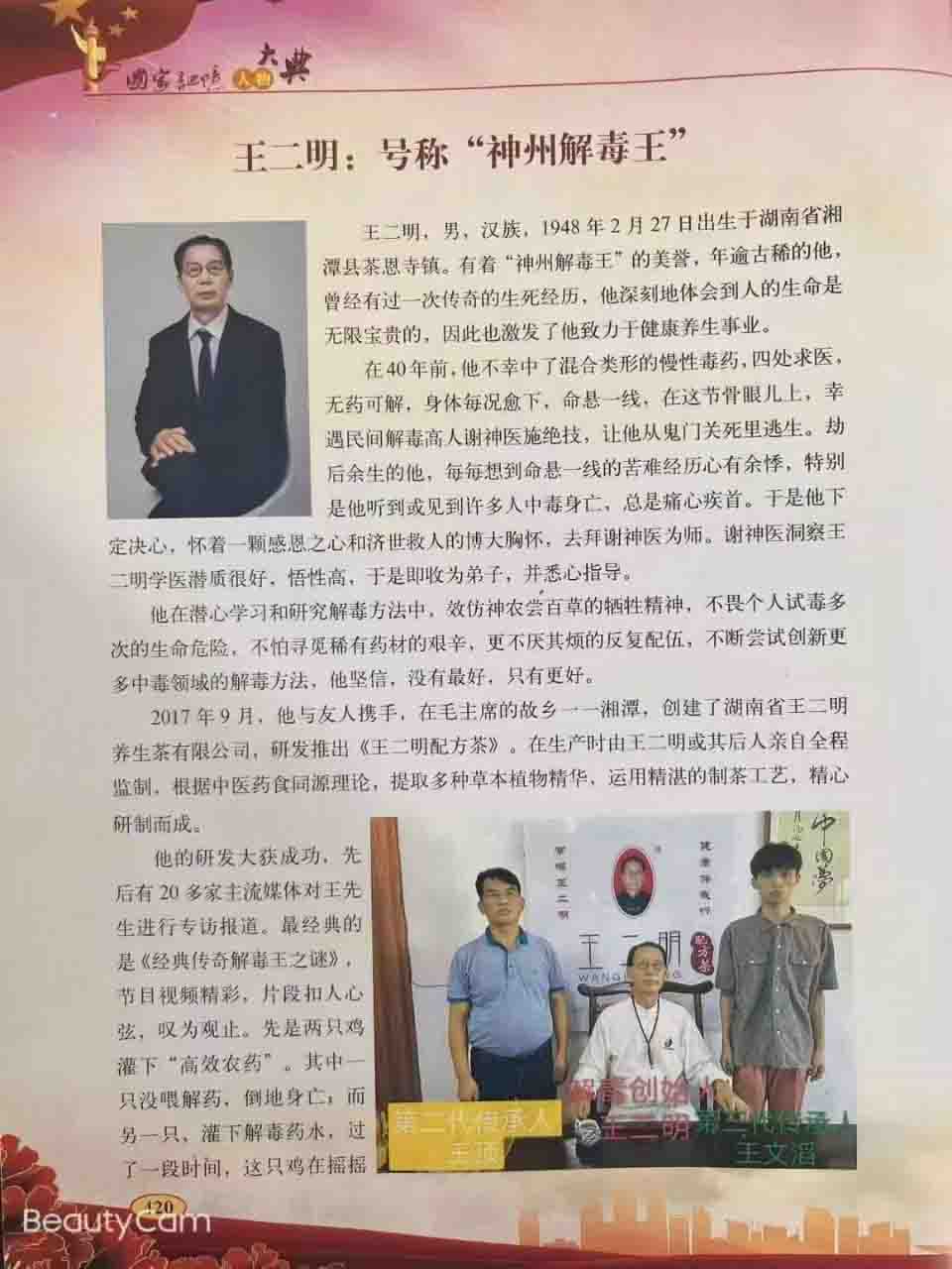 在37年前,王二明先生被人投毒后,命悬一线;幸遇民间解毒高人谢郎中搭救从鬼门关死里逃生。从此王二明先生拜谢郎中为师,潜心学习和钻研解毒方法。王二明先生传承了中华五千年的解毒文化,终于研制出了一套广谱性的解毒配方。